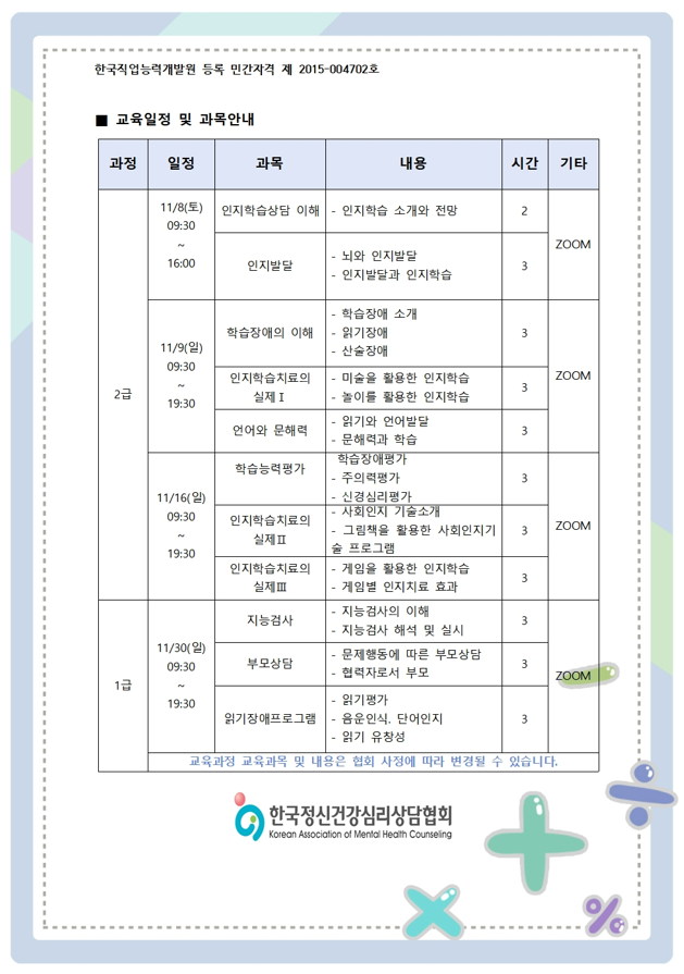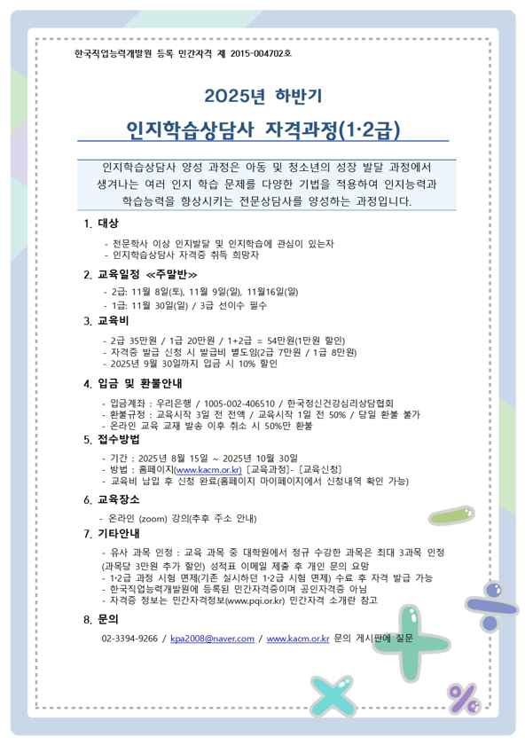 2025.하반기 인지학습상담사 1.2급 과정(기존 2.3급) 안내